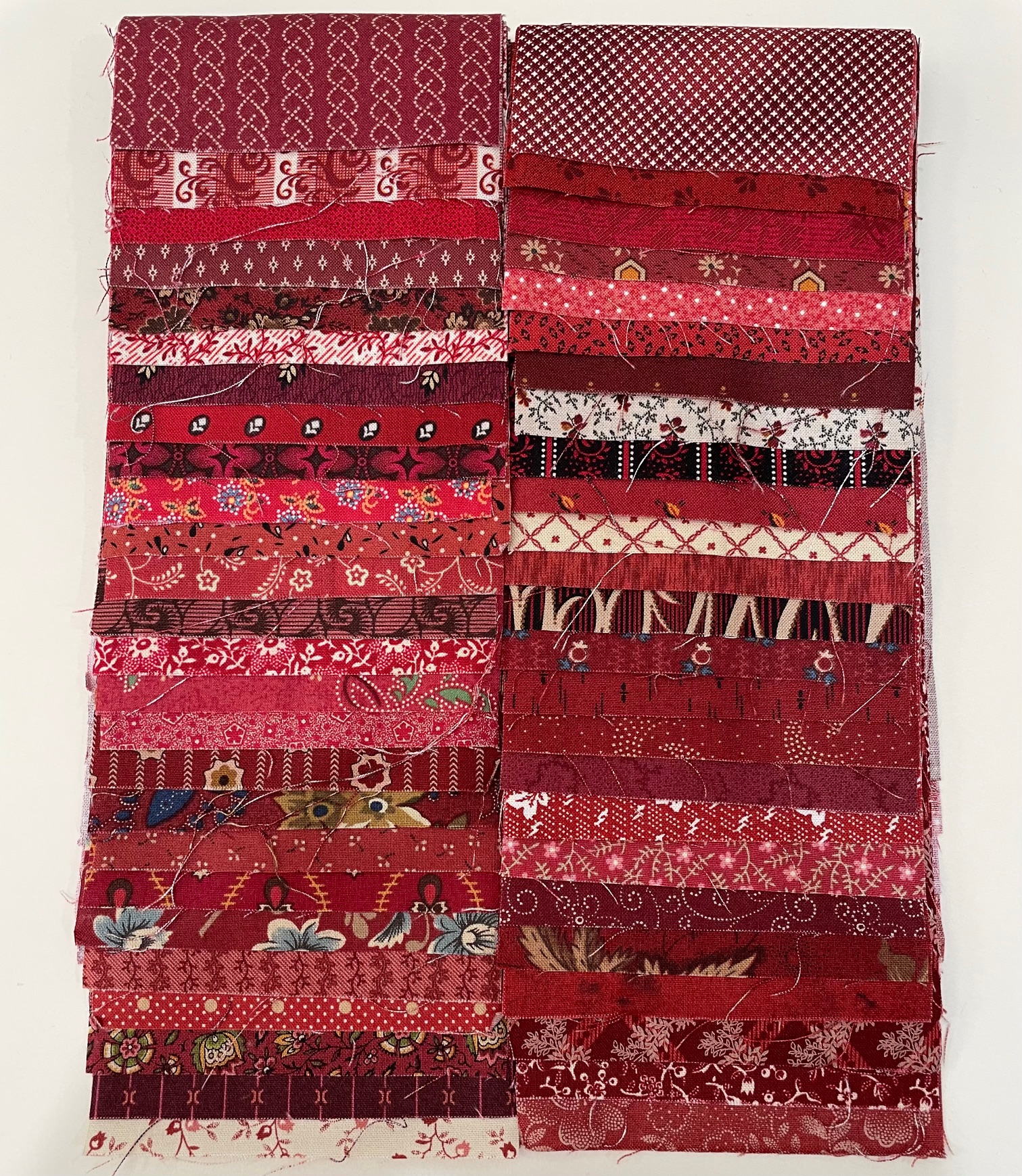 We have for sale a pack of strips that are 10cm by 30cm. (Roughly 4″ x 12″) This is a pack of 50, each fabric is different. Perfect for any sort of scrap quilt that you want to make. These are chosen for our range of reproduction fabrics.